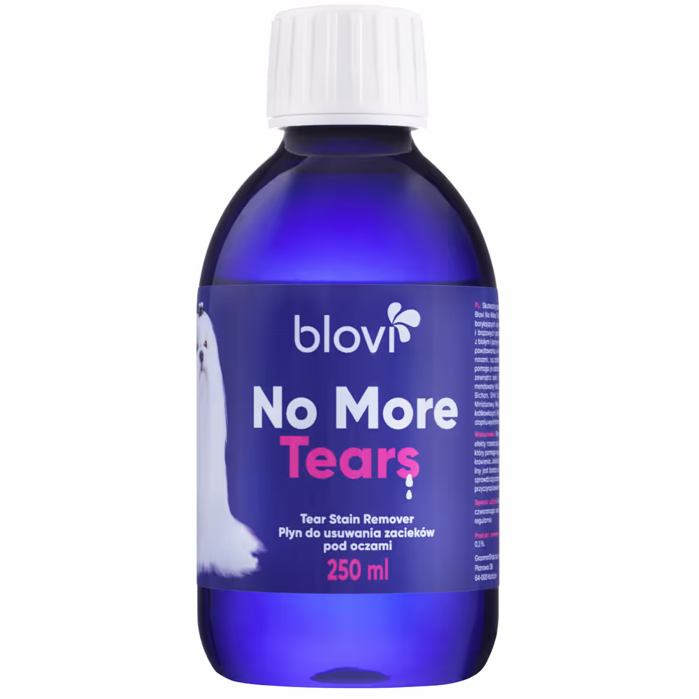 Skuteczny preparat do kompletnej higieny okolic oczu, Blovi No More Tears. Stworzony z myślą o psach i kotach borykających się z problemem nieestetycznych, rdzawych i brązowych przebarwień pod oczami, zwłaszcza u psów z białym i jasnym umaszczeniem. Najczęstszą przyczyną ich powstawania, w szczególności u czworonogów z krótkimi nosami, są zatkane kanaliki łzowe. Płyn No More Tears pomaga je odblokować, dzięki czemu łzy nie wypływają na zewnątrz oka i nie zabarwiają włosa. Preparat rekomendowany dla psów ras takich, jak: Maltańczyk, Pudel, Bichon, Shih Tzu, Pekińczyk, YorkShire Terrier, Szpic Miniaturowy, West, a także kotów: perskich i egzotycznych krótkowłosych. Regularne stosowanie pozwala w znacznym stopniu wyeliminować niepożądane zacieki.