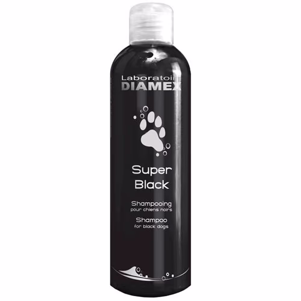 Diamex Super Black Shampoo to szampon z olejkiem migdałowym przeznaczony dla psów o czarnym kolorze sierści. Składniki produktu zostały dobrane tak, aby pogłębić naturalny kolor włosa i nadać im połysk. Dzięki zawartości olejku migdałowego włosy stają się nawilżone, odżywione, zregenerowane i pełne blasku. Wpływa on pozytywnie również na stan skóry zwierzęcia. Szampon posiada łagodne, nie powodujące podrażnień substancje myjące pochodzenia roślinnego. Pięknie pachnie migdałami. Nie zawiera silikonów, parabenów czy fenoksyetanolu.